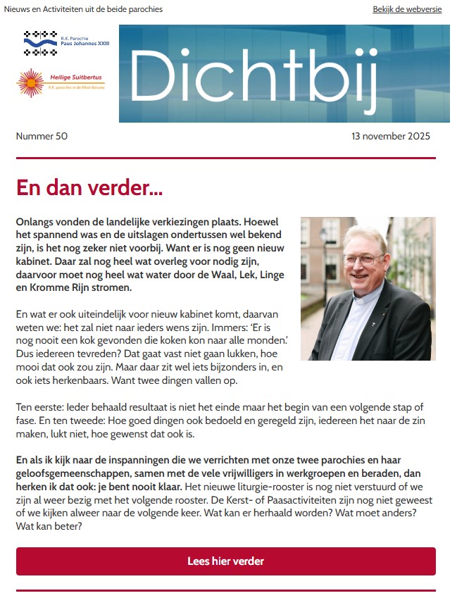 Dichtbij is de digitale nieuwsbrief met nieuws en activiteiten uit onze parochie en de H. Suitbertusparochie waar we mee samenwerken. Hij komt ongeveer 6 keer per jaar uit.